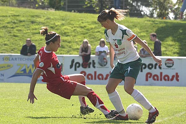 Stefanie Weichelt den Ball, den sie mustergültig von Duisburgs Torfrau Kathrin Längert zugespielt bekam, dann blockte Längert in der folgenden Szene einen Schuss von Susanne Kaspeczyk, die auf der