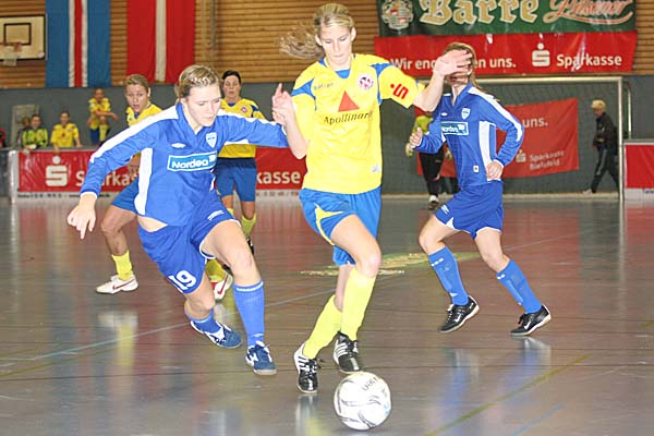 Verkehrte Welt in der Vorrunde: während in Gruppe 1 alles beim Alten blieb, Potsdam die Gruppe dominierte und Valur Reykjavic verdient ins Halbfinale einzog, gewann Djurgarden am zweiten Turniertag keine Partie mehr. Durch den 7:0-Kantersieg von Duisburg im letzten Spiel gegen Gütersloh wurde das Team von Thomas Obliers sogar noch Gruppenerster, punktgleich folgten Bröndby und das Team um Ariane Hingst, Nadine Angerer und Jenny Meier, das überraschend noch in die Platzierungsrunde musste. ![]() ![]() ![]() ![]() ![]() ![]() ![]() ![]() ![]() ![]() ![]() ![]() ![]() ![]() |