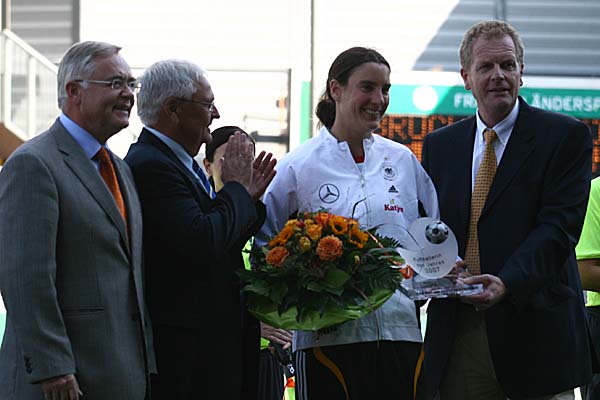 echter Kracher auf die DFB-Frauen am 30. August 2007 am Mainzer Bruchweg. Nach den völlig unterlegenen Schweizerinnen sollte nun also ein sportlich interessanter Vergleich auf dem Matchkalender