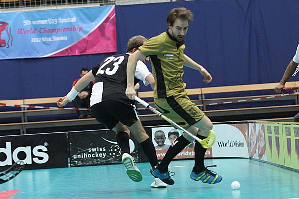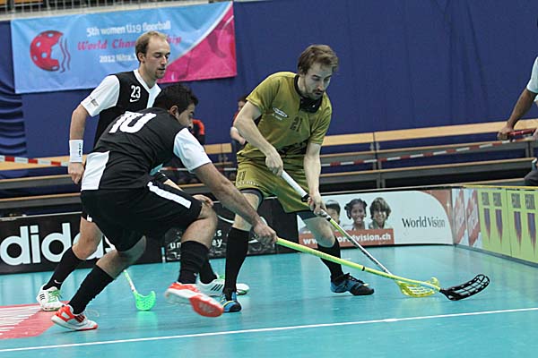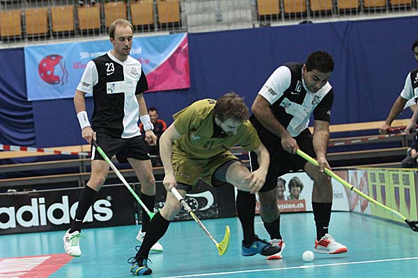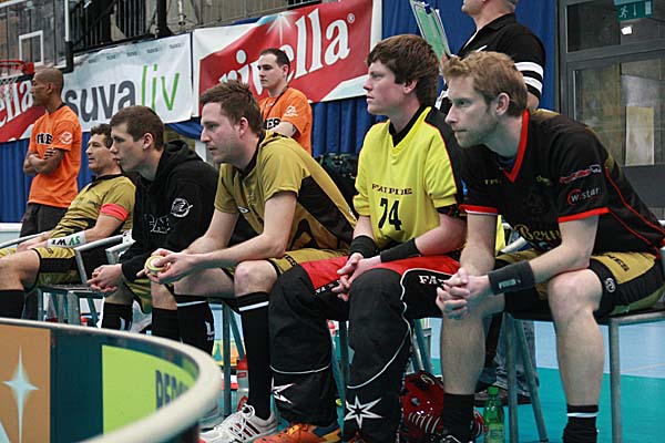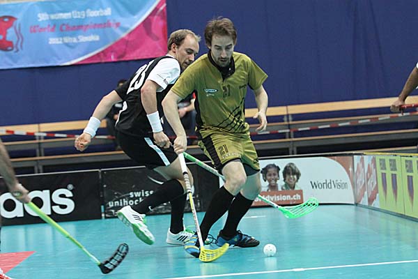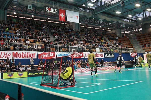 Zweites Spiel, das vermeidlich starke Geschlecht und trotz der gleichen Regeln ein ganz anderes Spiel: sicherlich, auch das Herren-Kleinfeld in der Schweiz ist von starker Taktik geprägt und benötigt viel technische Finesse, um mit schnellen Pässen die oft dichten Abwehrketten zu durchbrechen - doch nach dem eher sehr langsamen Spiel der Damen war im Ligapokal-Finale der Herren gleich deutlich mehr geboten: das erste Drittel gehörte eher den Berner Hurricanes, die gegen Nuglar United nach 14 Minuten mit 4:2 führten und dieses Ergebnis in die Pause retten konnten. Danach kam Nuglar zwar immer mal wieder auf, glich unter anderem mit einem Doppelschlag von Thomas Voegtli zum zwischenzeitlichen 4:4 aus - aber am Ende schienen die Berner immer eine Spur besser und gewiefter und liessen die Hoffnungen des Gegners im Keim ersticken - symptomatisch war hier zum Beispiel die 56. Minute: gerade nachdem United sich von 6:10 auf 8:10 herangearbeitet hatte und etwas mehr Schwung im Spiel zu haben schien, stellten die Canes mit Toren von Reto Luginbühl und Christian Moesch innerhalb von elf Sekunden den alten Viertore-Abstand wieder her - gleichzeitig war dieses 8:12 auch der Endstand, so dass die heimischen Zuschauer ihre Mannschaft bei der Siegesfeier bejubeln konnten.